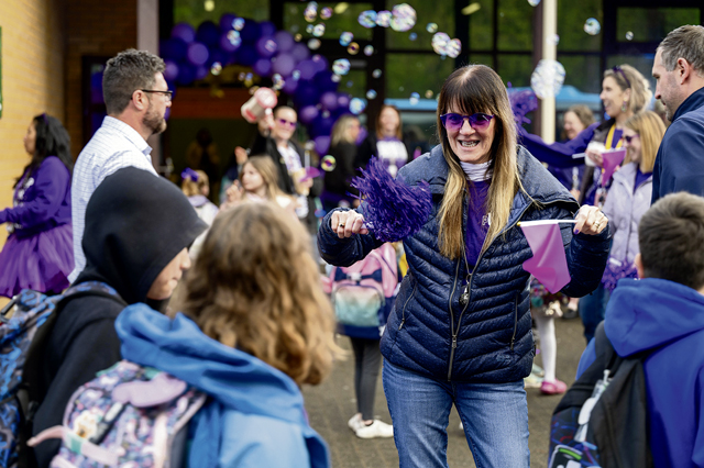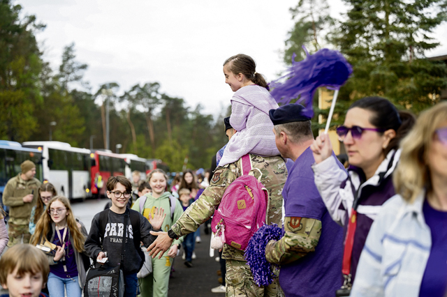 Members from the community line-up to greet children during Purple Up! Day at Ramstein Air Base, Germany, April 17, 2024. This event was hosted by Ramstein AB Elementary School and the 86th Security Forces Squadron in celebration of Month of the Military Child. (U.S. Air Force photo by Senior Airman Jordan Lazaro)
