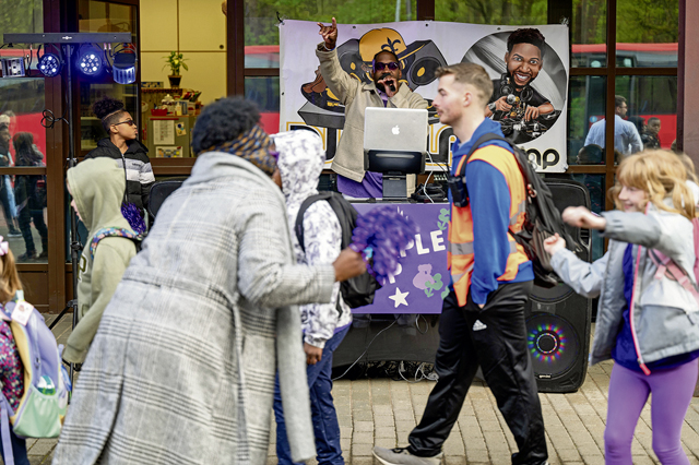 A DJ plays music during Purple Up! Day at Ramstein Air Base, Germany, April 17, 2024. During this event, children were greeted by school staff, security forces and community members in recognition of military children for their service commitment and sacrifice. (U.S. Air Force photo by Senior Airman Jordan Lazaro)