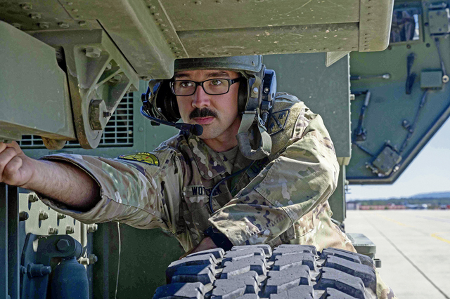 U.S. Army Chief Warrant Officer 2 Alex Wotachek, 4-133rd Field Artillery Regiment HIMARS maintenance officer, inspects an M142 High Mobility Rocket System (HIMARS) during training at Ramstein Air Base, Germany, Aug. 28, 2024. The HIMARS is a light, multiple rocket launcher system developed in the late 1990s and allows for rapid deployment of weapons capabilities. (U.S. Air Force photo by Airman 1st Class Dylan Myers)