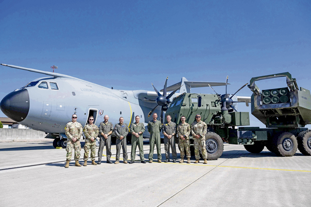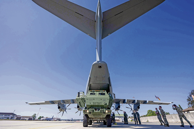 A U.S. Army M142 High Mobility Rocket System (HIMARS) unloads from a Luxembourg air force aircraft during training at Ramstein Air Base, Germany, Aug. 28, 2024. Members of the 4-133rd Field Artillery Regiment, Luxembourg Armed Forces and Belgian Air Component loaded and unloaded the HIMARS in the A400M in order to develop validated load plans for future operations. (U.S. Air Force photo by Airman 1st Class Dylan Myers)