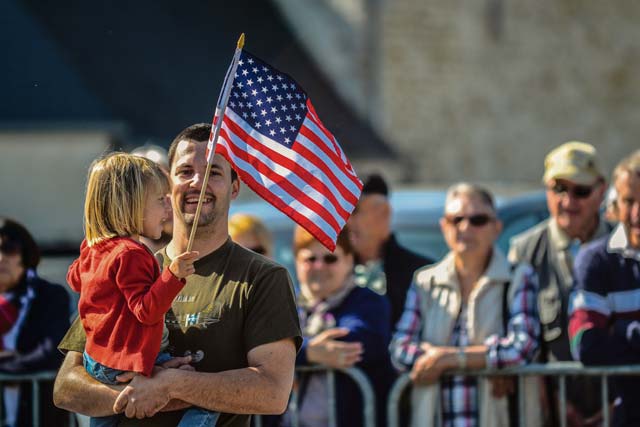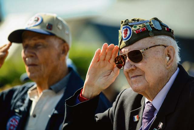 A World War II veteran salutes during “The Star-Spangled Banner” during a ceremony at the Picauville 9th Air Force monument June 4 in Normandy, France. More than 380 service members from Europe and affiliated D-Day historical units participated in the 71st Anniversary as part of Joint Task Force D-Day 71.