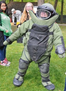 The Explosive Ordnance Disposal Company, 18th Combat Sustainment Comm-and, demonstrated how their robots disarm a bomb. There was also a Soldier clothed in his hazardous material suit ready to recover the bomb if needed. All of the students had the opportunity to test out the robots and try on the suit.