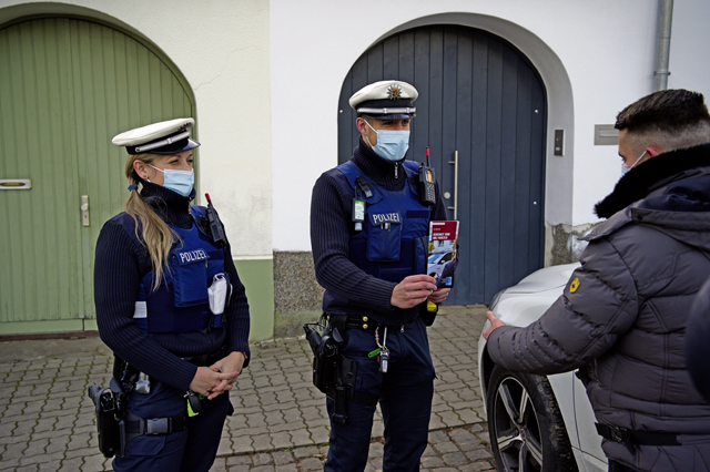 The German Polizei distributes pamphlets to raise awareness of theft from motor vehicles during Operation Opportunity Leads to Theft at Kaiserslautern, Nov. 24. In recent months, more cases of theft from motor vehicles have been reported to the German Polizei stations in Kaiserslautern. The Polizei found that the vehicles were often left unlocked.
