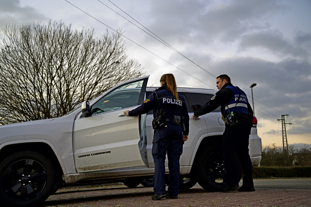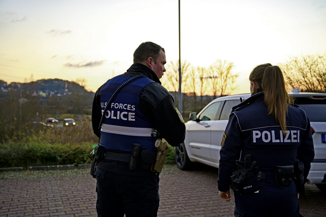 Stoeger Dirk, 569th U.S. Force Police Squadron team leader supervisor, and a member from the German Polizei prepare to start Operation Opportunity Leads to Theft at Otterbach, Germany Nov. 24. The German Polizei stations in Kaiserslautern relay to people living in the local area to not leave anything in the car that is important or has a high material value. Closed bags are a high target for thieves as well.