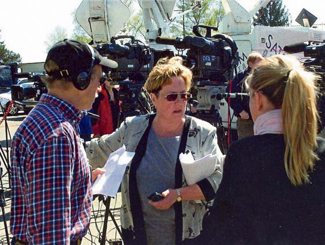 Marie Shaw (center) assists a news team from CNN sent to cover the arrival of wounded warriors at Landstuhl Regional Medical Center during the early stages of the war in Iraq.