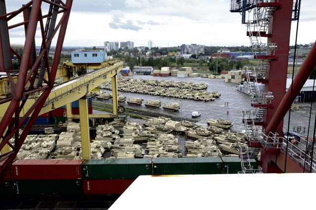 “The port operations here in Gdansk is the first arrival of our brigade’s equipment into the European theater,” said Lt. Col. Rick Montcalm, the squadron commander of 1st Squadron, 4th Calvary Regiment, 1st ABCT. “We will download at the end of today over 1000 pieces of combat equipment prepared for onward movement to our various forward operating stations. Port Operations like any new operation has presented unique challenges but also unique opportunities both for the organization and the individuals involved in downloading the vessel.”
