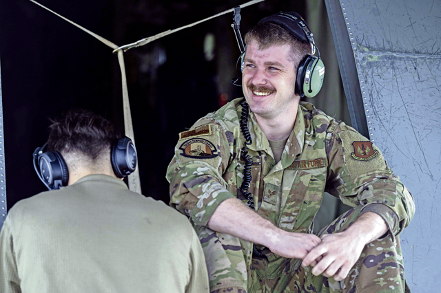 U.S. Air Force Senior Airman Cory Romeyn, right, speaks with Staff Sgt. Joseph Miller, 86th Aircraft Maintenance Squadron flying crew chiefs, at 33rd Air Base, Powidz, Poland, during Aviation Detachment 21.4 Sept. 16, 2021. The 37th Airlift Squadron, 435th Contingency Response Support Squadron, and 86th Aircraft Maintenance and Maintenance Squadron are among a number of units participating in Aviation Rotation 21-4. (U.S. Air Force photo by Senior Airman Taylor Slater)