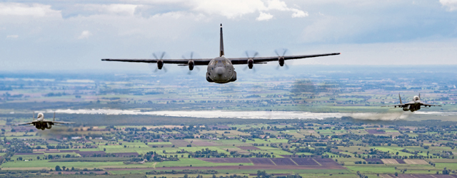 A U.S. Air Force C-130J Super Hercules aircraft, assigned to the 37th Airlift Squadron, Ramstein Air Base, Germany, and two Polish air force MiG-29 jet fighter aircraft, assigned to the Polish air force’s 1st Tactical Air Wing, fly in formation at Powidz, Poland, Sept. 21, 2021. Combined training and theater security cooperation engagements with allies like Poland demonstrate our shared commitment to maintaining a safe and secure Europe. (U.S. Air Force photo by Airman Edgar Grimaldo)