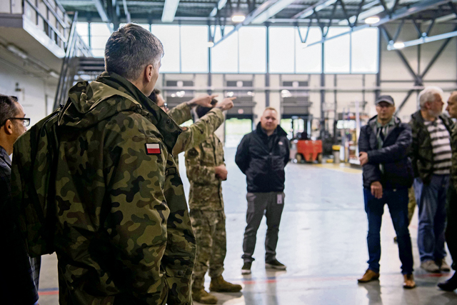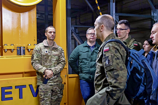 Polish airmen tour the 721st Aerial Port Squadron at Ramstein Air Base, Germany, on October 26, 2022. During the tour, briefers from the 721st APS provided an overview of their facilities, equipment and capabilities showcasing the infrastructure for Polish engineers to create a blueprint for a future aerial port in Wroclaw, Poland. (U.S. Air Force photo by Senior Airman Alexcia Givens)