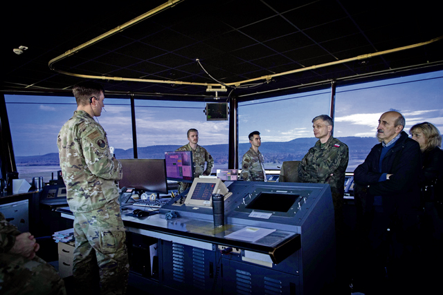 U.S. Air Force Staff Sgt. Derek Schafer, left, 86th Operation Support Squadron air traffic controller, provides an overview of the watch tower facility, equipment and capabilities to Polish air force leaders at Ramstein Air Base, Germany, Oct. 27, 2022. The U.S. and Poland signed the Enhanced Defence Cooperation Agreement, which provides means to support current U.S. forces while planning for future infrastructure and logistical support. (U.S. Air Force photo by Senior Airman Alexcia Givens)