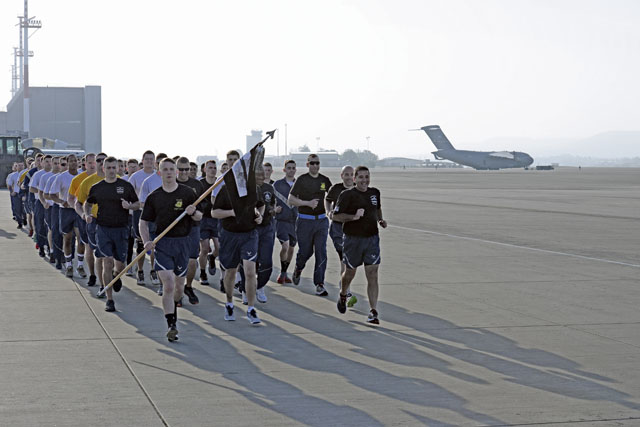 Memorial run participants performed a formation run around the flightline. After the run, active duty, reserve, guard, veteran, and retired Port Dawgs met in front of the 721st APS Passenger Terminal for hotdogs and hamburgers donated by the United Service Organization, and unit booster clubs.