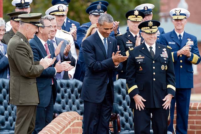 President Barack Obama, Secretary of Defense Ash Carter and Marine Gen. Joseph F. Dunford Jr., the new chairman, applaud outgoing Chairman of the Joint Chiefs of Staff Army Gen. Martin E. Dempsey during the change of responsibility ceremony at Summerall Field on Joint Base Myer-Henderson Hall in Arlington, Va., Sept. 25.