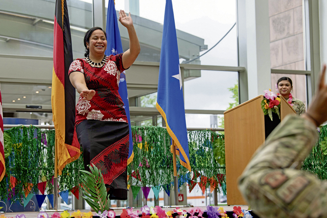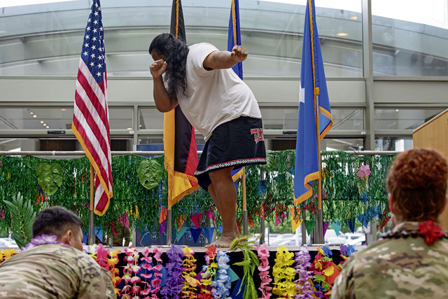 U.S. Air Force Master Sgt. Desirae Faasavalu, 786th Force Support Squadron Force Management section chief, performs a traditional dance as a part of an Asian American and Pacific Islander Heritage Month closing ceremony at Ramstein Air Base, Germany, May 31, 2024. This year’s theme for AAPI month is “Advancing Leaders Through Innovation”, which celebrates pioneers in the areas of science, art, business, civilian public service and military strategy. (U.S. Air Force photo by Airman 1st Class Trevor Calvert)