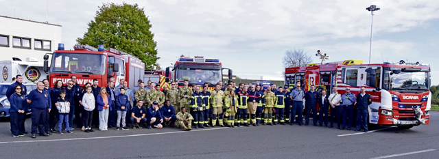 Service Members from the 86th Civil Engineer Squadron fire department and local German firefighters pose for a photo during a Fire Prevention Week open house at Ramstein Air Base, Germany, Oct. 22, 2022. This year marks the 100th anniversary of Fire Prevention Week. (U.S. Air Force photo by Jennifer Green-Lanchoney)