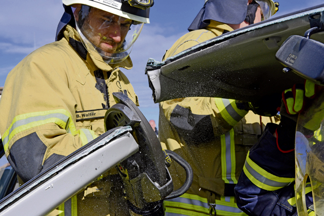 Firefighters from the Carlsberg and Hettenleidelheim fire department performed an extraction demonstration during an 86th Civil Engineer Squadron Fire Prevention Week open house at Ramstein Air Base, Germany, Oct. 22, 2022. The demonstration was one of several educational opportunities during the open house for RAB and host nation families. (U.S. Air Force photo by Jennifer Green-Lanchoney)