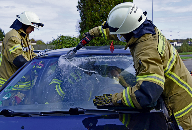 A firefighter from the Carlsberg and Hettenleidelheim fire department uses the Jaws of Life to demonstrate a vehicle extraction during an 86th Civil Engineer Squadron fire department Fire Prevention Week open house at Ramstein Air Base, Germany, Oct. 22, 2022. Fire Prevention Week is a yearly observance, which aims to eliminate losses due to fire, electrical, and related hazards through events and education. (U.S. Air Force photo by Jennifer Green-Lanchoney)