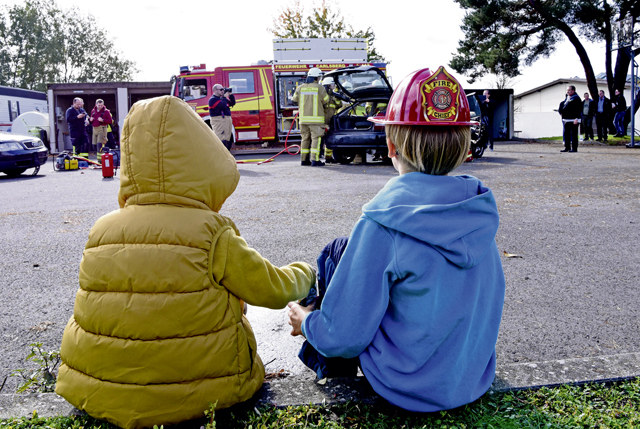 Children watch an extraction demonstration during an 86th Civil Engineer Squadron Fire Prevention Week open house at Ramstein Air Base, Germany, Oct. 22, 2022. The open house was one of many events during the week, which included a parade and visits to RAB schools. (U.S. Air Force photo by Jennifer Green-Lanchoney)