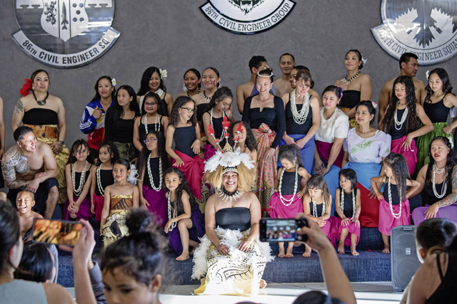 Members of the Ramstein Asian American and Pacific Islander Heritage committee perform a traditional Samoan dance at the AAPIH month closing ceremony at Ramstein Air Base, Germany, May 30, 2023. The closing ceremony featured multiple dance performances from different AAPI cultures. (U.S. Air Force photo by Staff Sgt. Emmeline James)