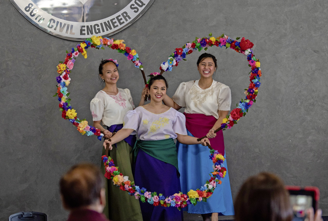 Dancers perform the bulaklakan at the Asian American and Pacific Islander Heritage Month closing ceremony at Ramstein Air Base, Germany, May 30, 2023. The bulaklakan is a Filipino folk dance and was one of many performances at the event. (U.S. Air Force photo by Staff Sgt. Emmeline James)