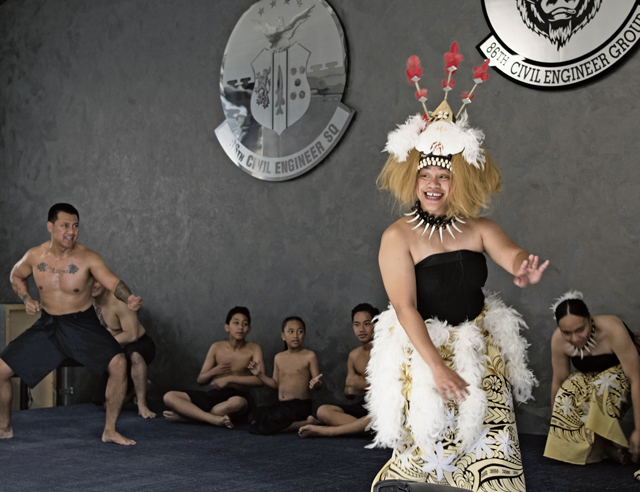 U.S. Air Force Master Sgt. Desirae Faasavalu, 786th Force Support Squadron installation personnel readiness section chief, performs a traditional Samoan dance at the Asian American and Pacific Islander Heritage Month closing ceremony at Ramstein Air Base, Germany, May 30, 2023. The closing ceremony featured cultural performances and food representing a range of AAPI backgrounds, including Samoa, Hawaii, the Philippines and Guam. (U.S. Air Force photo by Staff Sgt. Emmeline James)