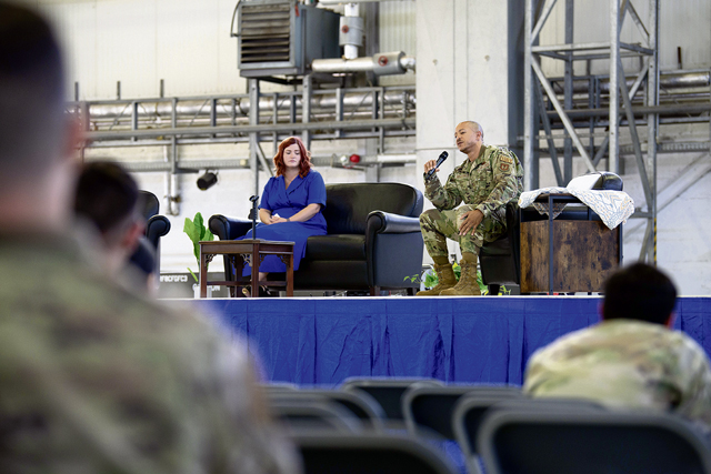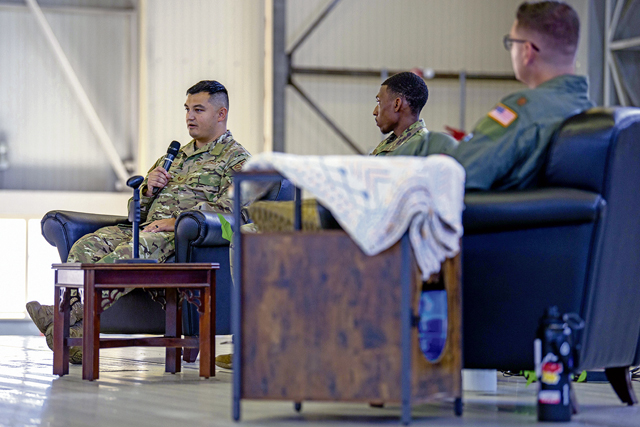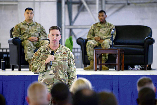 U.S. Air Force Master Sgt. Darnell Holyfield, 86th Aircraft Maintenance Squadron first sergeant, right, shares his story during a storytellers event at Ramstein Air Base, Sep. 27. Holyfield shared the story of his career and how the different hardships he faced made him stronger.