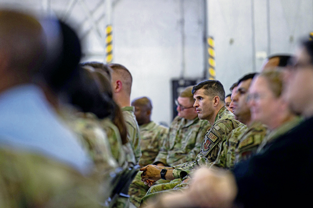 U.S. Air Force Senior Master Sgt. Matthew Thomas, 86th Security Forces Squadron logistics and readiness superintendent, listens as five speakers share their stories during a storytellers event at Ramstein Air Base, Sep. 27.