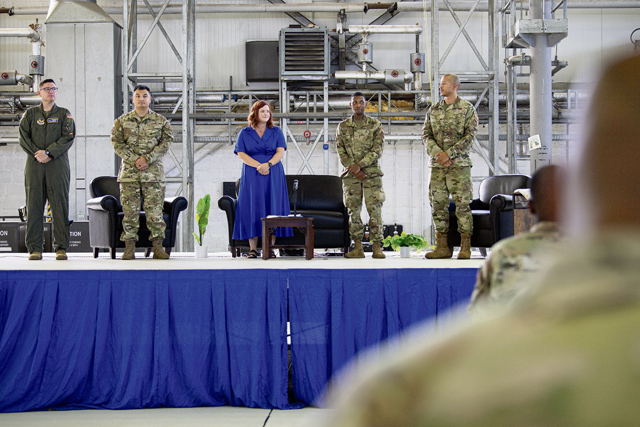 U.S. Air Force Chief Master Sgt. Louis Ludwig, 86th Airlift Wing command chief, left, gives remarks at the beginning of a storytellers event at Ramstein Air Base, Sep. 27. Storytellers is a yearly event where speakers from around Ramstein AB come to share stories about the hardships they have endured and how they overcame them.