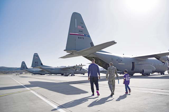 Tech. Sgt. Seth Wilkinson, 86th Aircraft Maintenance Squadron unit deployment manager, and his son walk with Kyle Rudolph, NFL Minnesota Vikings tight end, to a C-130J during Rudolph’s visit April 7 to Ramstein Air Base. Rudolph spent four days in the Kaiserslautern Military Community. During this time, he toured Ramstein Air Base, Kapaun Air Base, Vogelweh and Sembach. He spoke with Airmen, took pictures with them and signed autographs. On April 7 and 8, Rudolph hosted a football camp at the Kaiserslautern High School football stadium where he emphasized the fundamentals of the game.