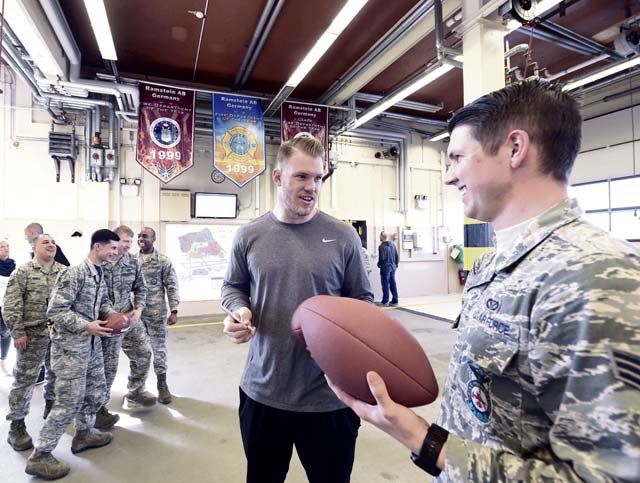 Firefighters from the 86th Civil Engineer Squadron receive autographs from Kyle Rudolph, NFL Minnesota Vikings tight end, after giving him a tour of the firehouse April 6 on Ramstein Air Base. The firefighters showed Rudolph how to put on the fire-retardant suit and demonstrated how to use some of the gear they use.