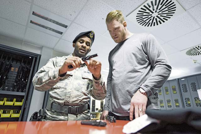 Tech. Sgt. Deandre Harrington, 86th Security Forces Squadron police services noncommissioned officer in charge, shows Kyle Rudolph, NFL Minnesota Vikings tight end, how to properly disassemble and clean an M9 handgun April 6 on Ramstein Air Base. Harrington explained to Rudolph that if proper care isn’t taken with a firearm, it may misfire when needed.