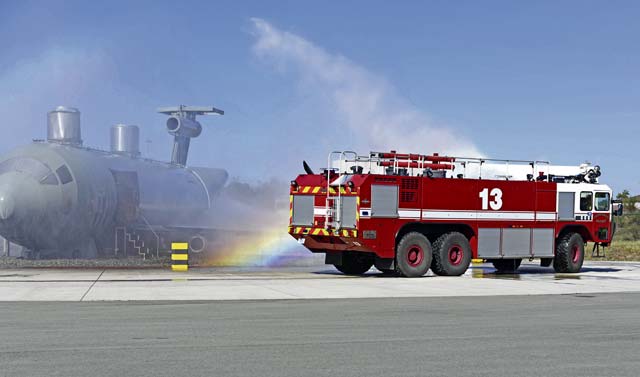 Kyle Rudolph, Minnesota Vikings tight end, operates a water cannon on an 86th Civil Engineer Squadron firetruck to extinguish flames surrounding a mock C-130 April 6 on Ramstein Air Base. As one of the largest firehouses in the U.S. Air Force, firefighters from the 86th CES routinely participate in readiness exercises and play a vital role in the Ramstein mission.