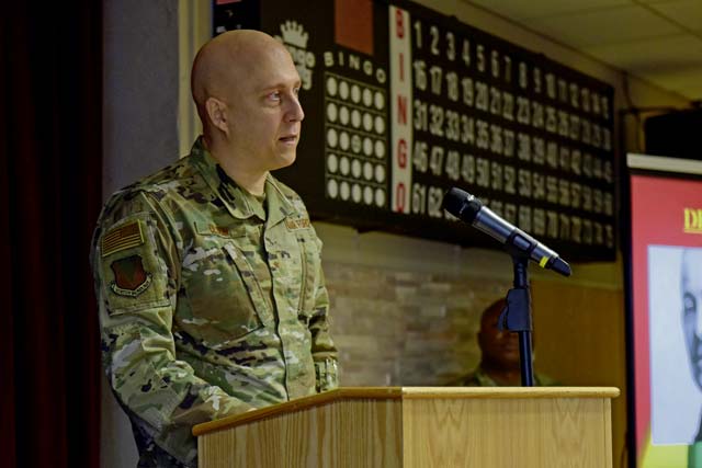 U.S. Air Force Brig. Gen. Josh Olson, 86th Airlift Wing commander, speaks at the Black History Month luncheon hosted at Ramstein Air Base, Feb. 28. This year’s BHM theme focused on Black Health and Wellness.