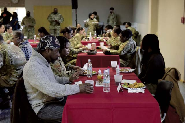 Members of the Kaiserslautern Military Community enjoy food and each other’s company at the Black History Month luncheon at Ramstein Air Base, Feb. 28. The luncheon included music, singing and storytelling to highlight this year’s theme: Black Health and Wellness.