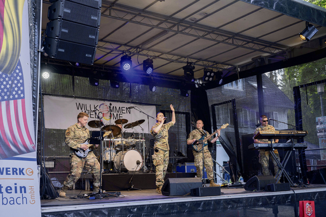 United States Air Forces in Europe band “Touch’n Go” performs at the German-American Friendship Festival at Ramstein-Miesenbach, Germany, June 7, 2024. “Touch’n Go” supports military functions and engages local communities through musical entertainment. (U.S. Air Force photo by Airman 1st Class Eve Daugherty)