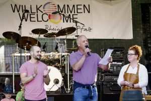 John Constance, “Welcome to Rheinland-Pfalz! Our neighbors from the USA” program manager, speaks onstage at the German-American Friendship Festival at Ramstein-Miesenbach, Germany, June 7, 2024. Constance and Ralf Hechler, City and Union Community Ramstein-Miesenbach mayor, welcomed U.S. Air Force Brig. Gen. Adrienne L. Williams, 86th Airlift Wing commander, to the annual celebration and spoke of efforts to continue growing the bond between local German and American communities. (U.S. Air Force photo by Airman 1st Class Eve Daugherty)
