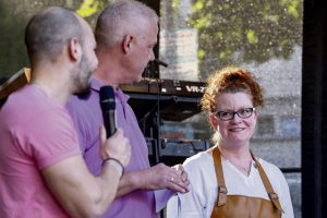 U.S. Air Force Brig. Gen. Adrienne L. Williams, 86th Airlift Wing commander, right, and John Constance, “Welcome to Rheinland-Pfalz! Our neighbors from the USA” program manager, left, join Ralf Hechler, City and Union Community Ramstein-Miesenbach mayor onstage for opening remarks during the German-American Friendship Festival at Ramstein-Miesenbach, Germany, June 7, 2024. The festival celebrated friendship between local German and American communities. (U.S. Air Force photo by Airman 1st Class Eve Daugherty)