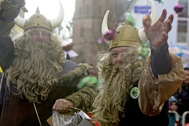 Men throw candy during a Fasching parade in Ramstein-Miesenbach, Feb. 25. In the Middle Ages, Fasching, or Karneval, gave people a break from the class system, allowing them to hide their social background behind masks and costumes.