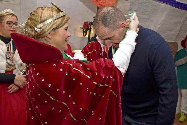 U.S. Air Force Col. Matthew S. Husemann, 86th Airlift Wing vice commander, receives a medal from the Fasching princess in Ramstein-Miesenbach, Feb. 25. As part of Fasching tradition, first-time participants in the festival receive a medal as well as a kiss on the cheek from the Fasching princess.