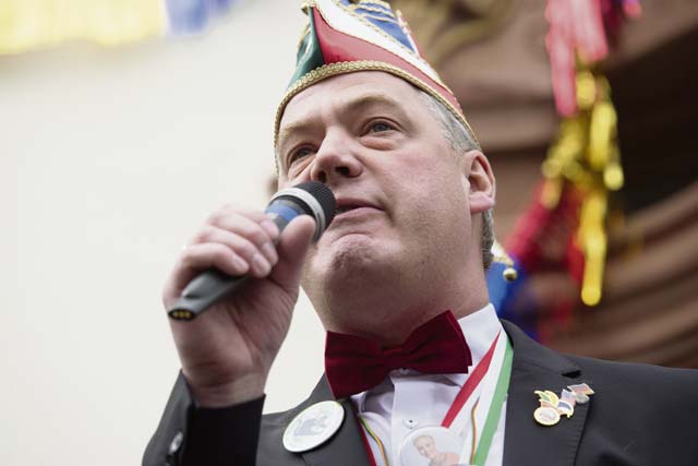 Ralf Hechler, Ramstein-Miesenbach union community mayor, speaks during Fasching, a festival held across Europe, in Ramstein-Miesenbach, Feb. 25. Fasching is a day for citizens to express themselves, celebrate and break the rules. In Germany, particularly in the Rheinland (Cologne) area, the tradition can be traced back to medieval times when people lived under harsh rules.