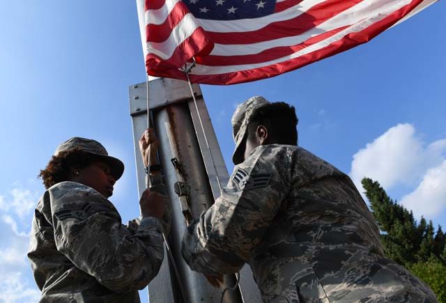 Airman 1st Class Bria Jackson, 786th Civil Engineer Squadron emergency management specialist (left), and Senior Airman Daneeka Mucker, 86th Logistics Readiness Squadron HAZMART pharmacy specialist, lower the American flag during a 9/11 memorial retreat ceremony Sept. 9 on Ramstein.