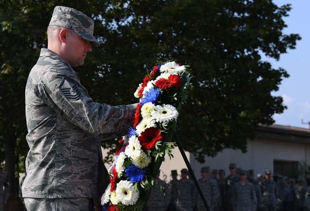 Master Sgt. Jesse Burkard, 86th Civil Engineer Squadron fire protection superintendent, lays a wreath during a 9/11 memorial retreat ceremony Sept. 9 on Ramstein. During the attacks, 2,977 people lost their lives and over 6,000 were injured, resulting in the largest domestic terrorist attack in U.S. history.