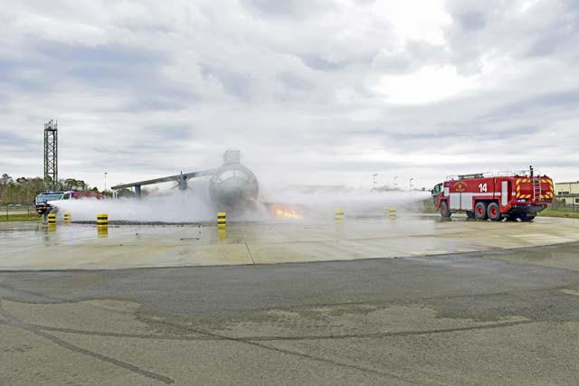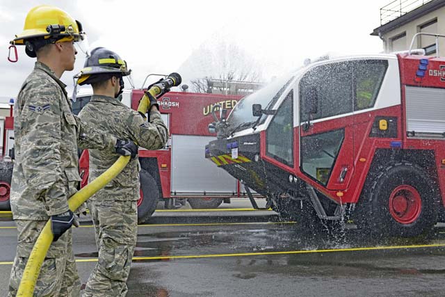 Two newly inducted fire trucks assigned to the 86th Civil Engineer Squadron, numbered 11 and 14, end the induction ceremony by dousing a fire at the fire ground training pit April 10 on Ramstein Air Base.