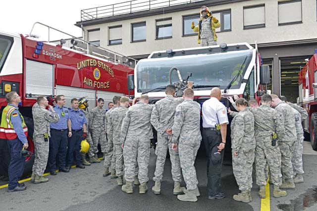 86th Civil Engineer Squadron firefighters and team members pray with newly inducted firetrucks April 10 on Ramstein Air Base. The two new trucks are equipped with ultra-high water pressure, making them more efficient when fighting fires.