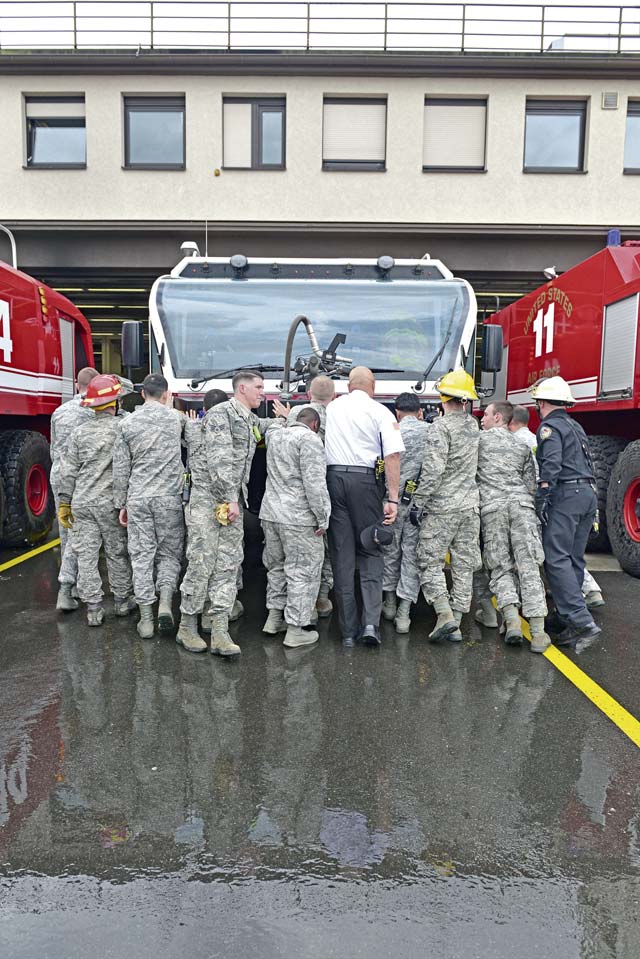 86th Civil Engineer Squadron firefighters and other team members push the new trucks into Fire Station One during an induction ceremony April 10 on Ramstein Air Base. The new trucks, numbered 11 and 14, replaced two other firetrucks commissioned more than a decade ago.