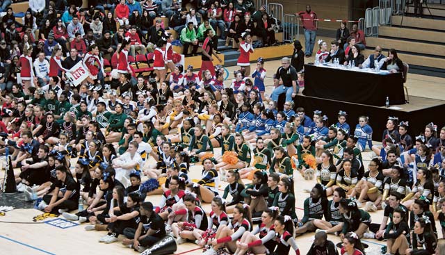 More than 15 teams from throughout Department of Defense Dependents Schools-Europe fill the Wiesbaden Fitness Center to watch and compete in the 2014 Cheer Competition Feb. 22 in Wiesbaden. Each team performed a 2 1/2-minute routine to determine the best squad in division I, II and III.
