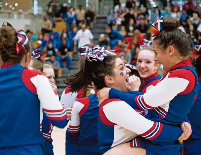 Members of the Ramstein Royals cheer squad celebrate after winning first place in the Division I 2014 Cheer Competition. The Royals have earned first place two years in a row.