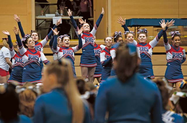 Members of the Ramstein Royals cheer squad finish their routine Feb. 22. The Royals won first place for Division I in the 2014 Cheer Competition.