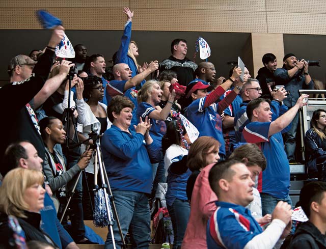 Fans root for the Ramstein Royals cheer squad during the cheerleading championship. Teams were graded on everything from tumbling to building.