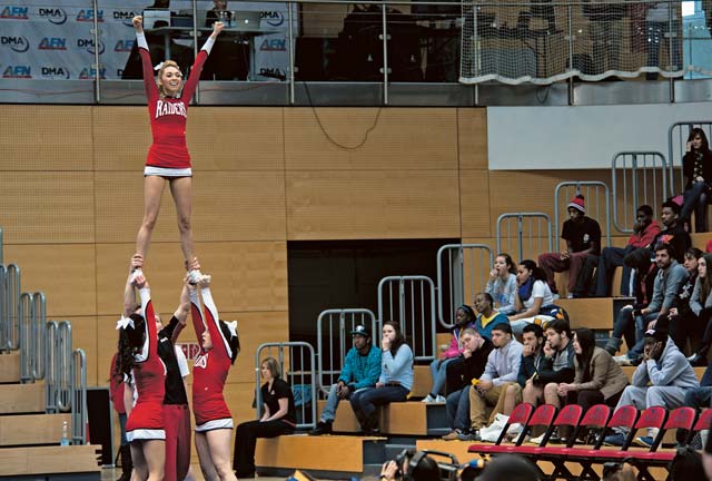 Members of the Kaiserslautern Raiders cheer squad perform their routine during the championship Feb. 22. The Raiders received the spirit award for Division I.