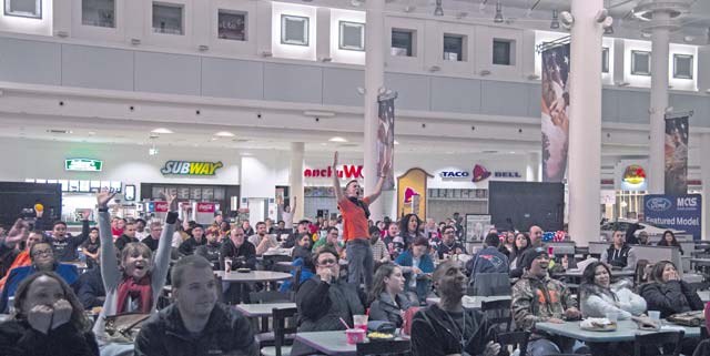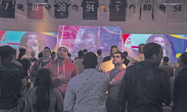 Seattle Seahawks fans celebrate after their team scored a touchdown against the New England Patriots during Super Bowl XLIX Feb. 1 on Ramstein. New England won the Super Bowl after stopping Seattle in the final minute of the game.